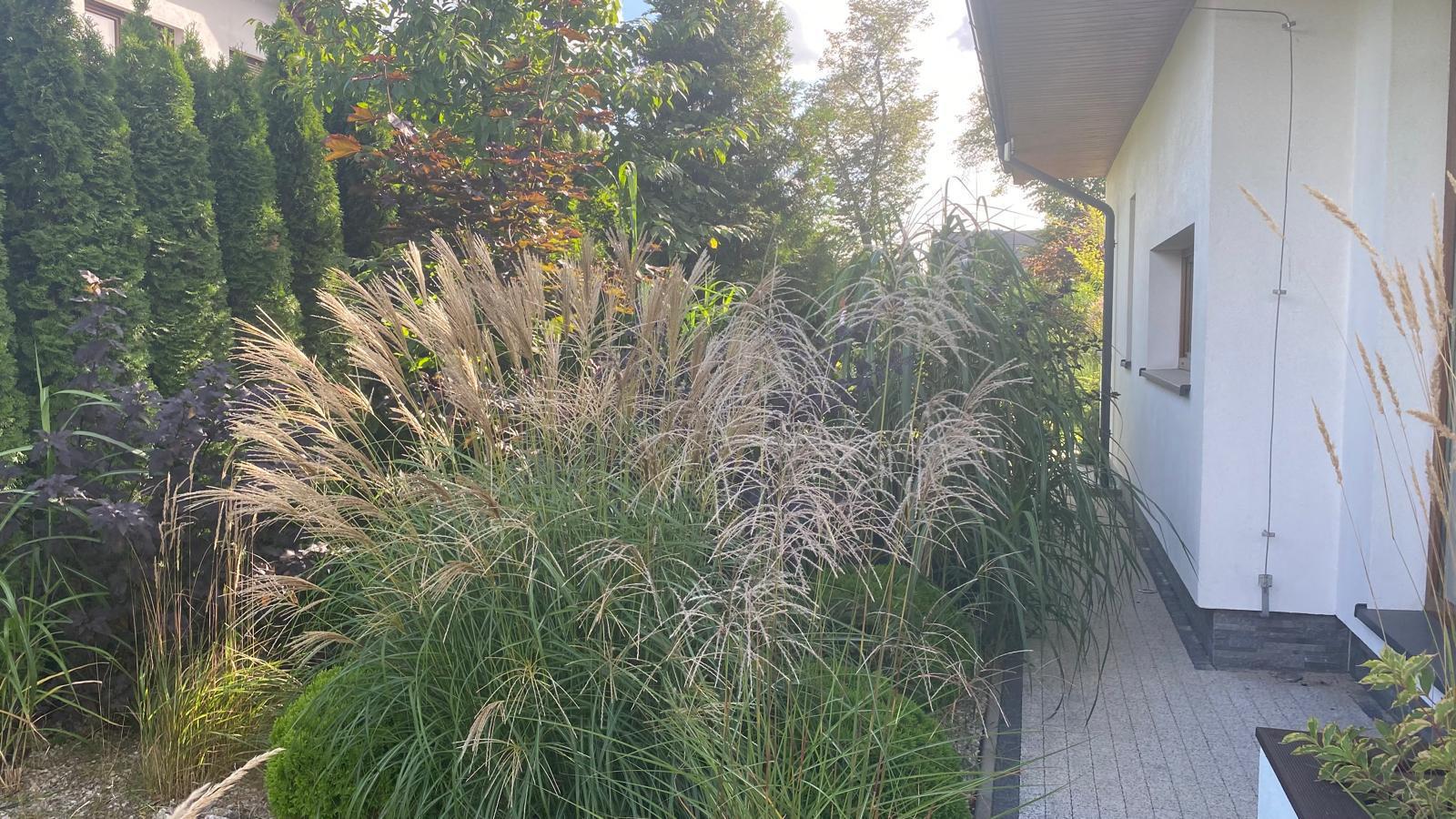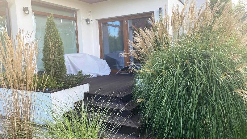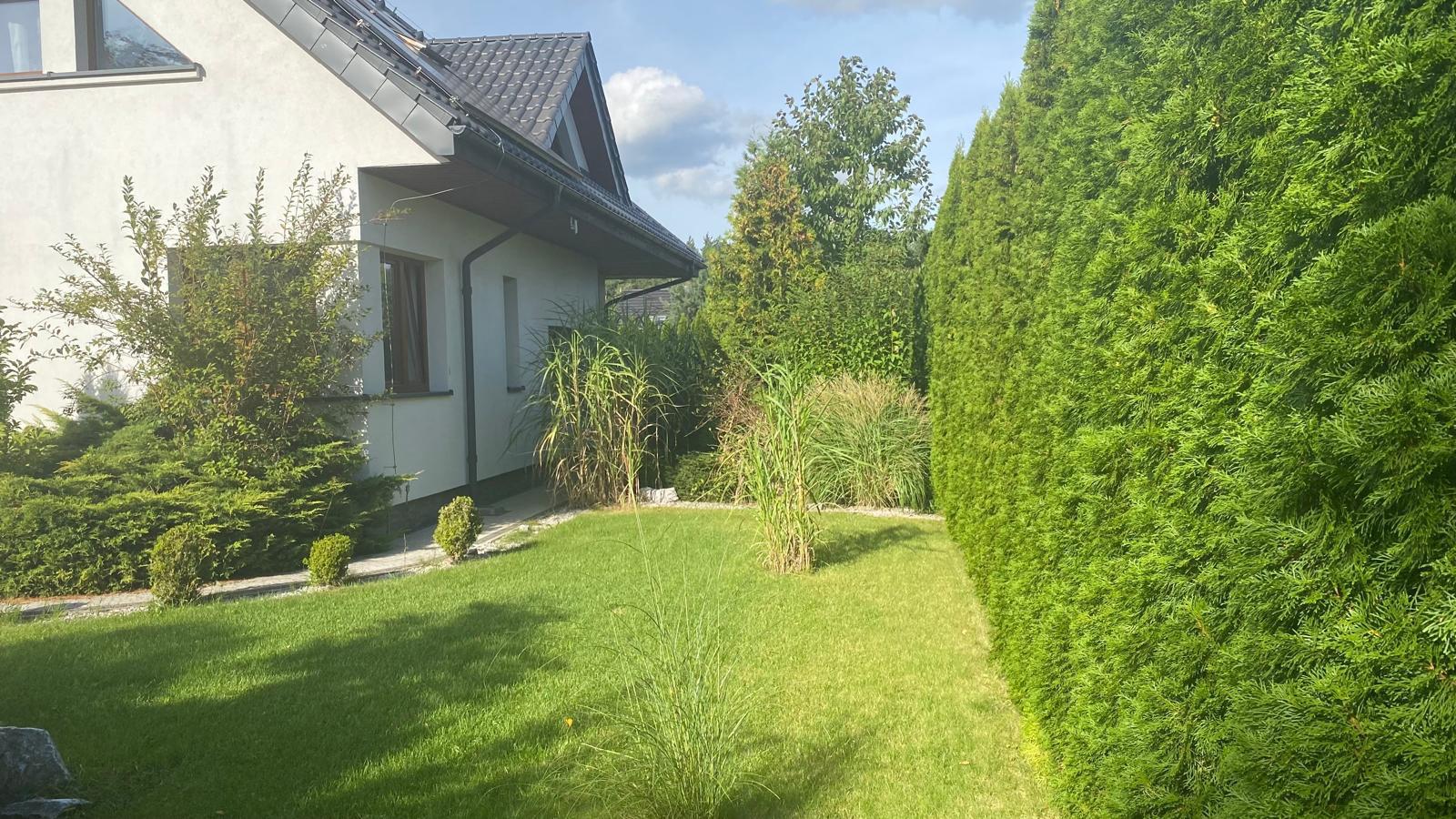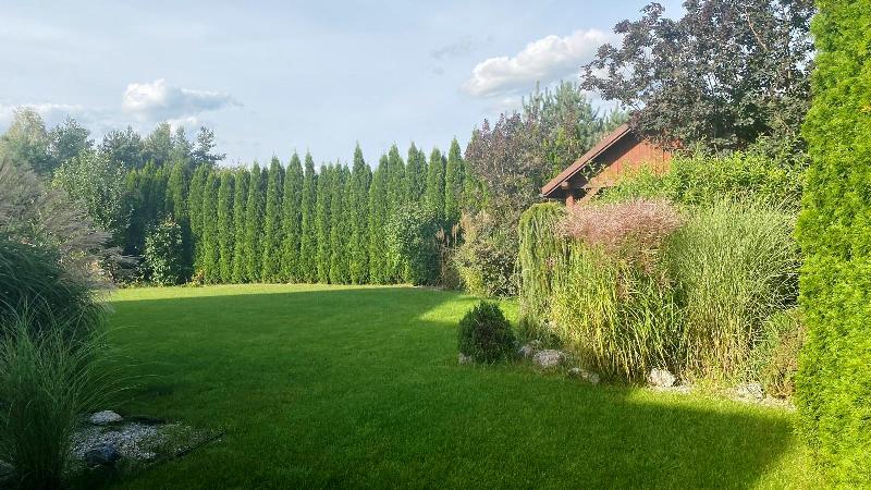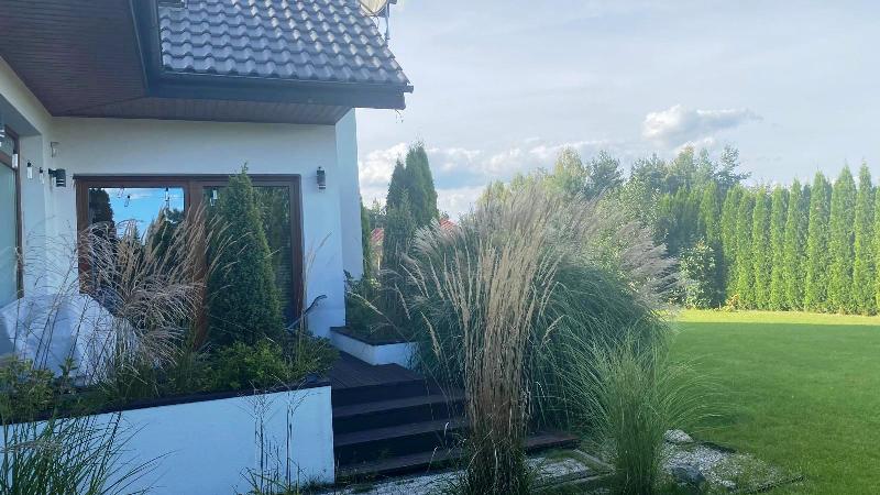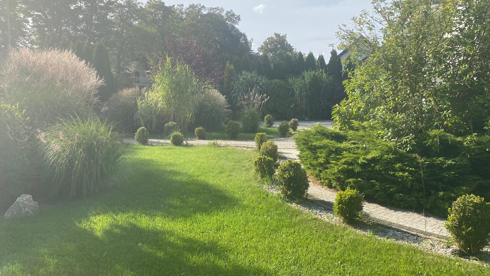 Zagospodarowana działka to prawdziwa oaza – liczne trawy ozdobne, krzewy, drzewa owocowe i dekoracyjne w harmonii z dużymi kamieniami i elementami skalnymi. Całość dopełnia automatyczny system nawadniania (4 sekcje).