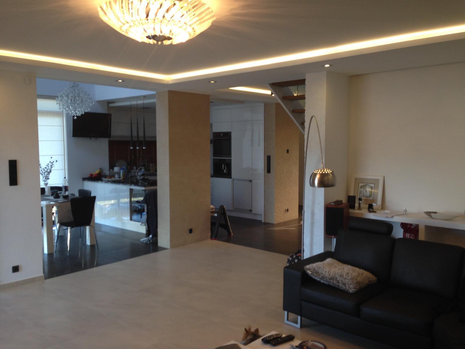 Na parterze znajduje się otwarta strefa dzienna: salon z kominkiem (16 kW – Spartherm), jadalnia z antresolą (wysokość 6,5 m!) oraz kuchnia z pełnym wyposażeniem. Z salonu bezpośrednie wyjście na taras z drewnianą deską i widokiem na ogród.