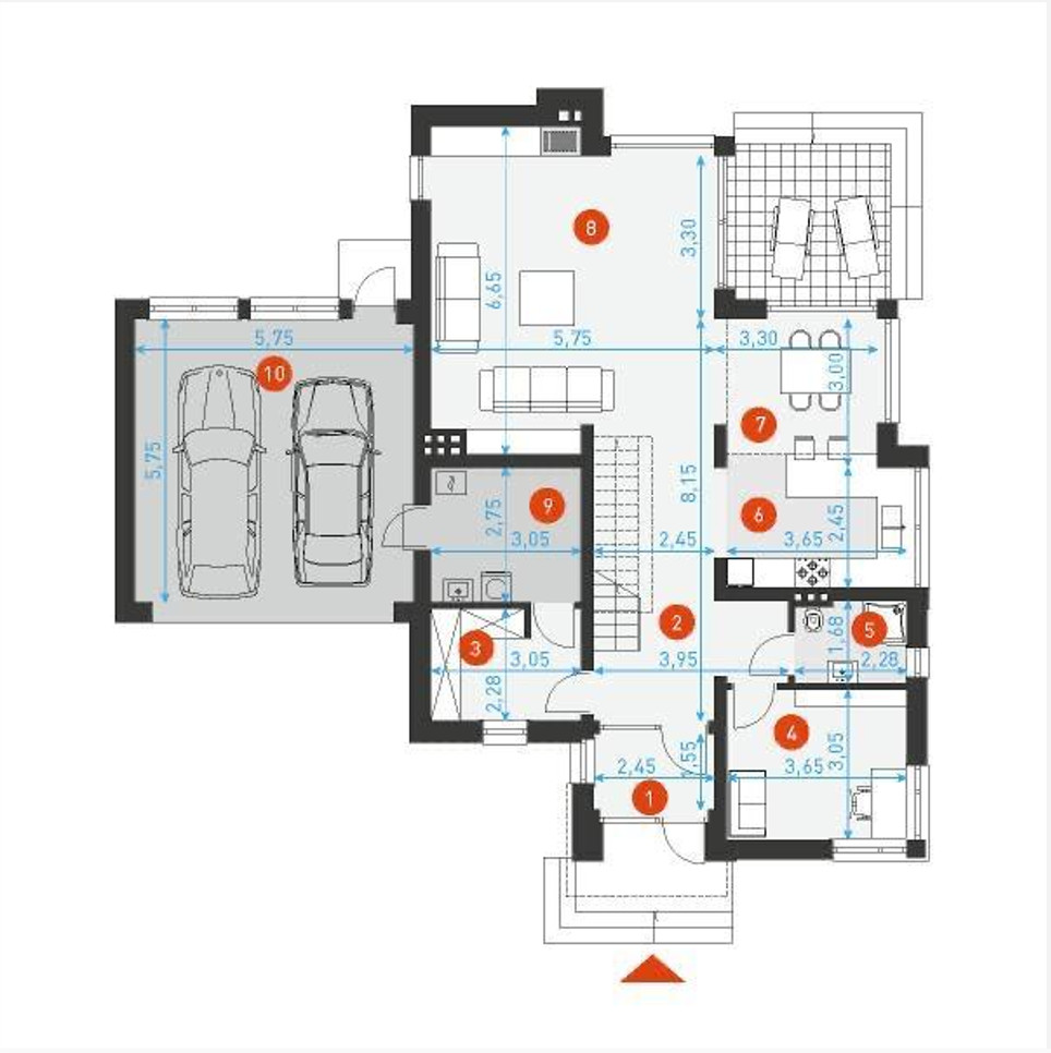 przestronny garaż dwustanowiskowy w bryle budynku.